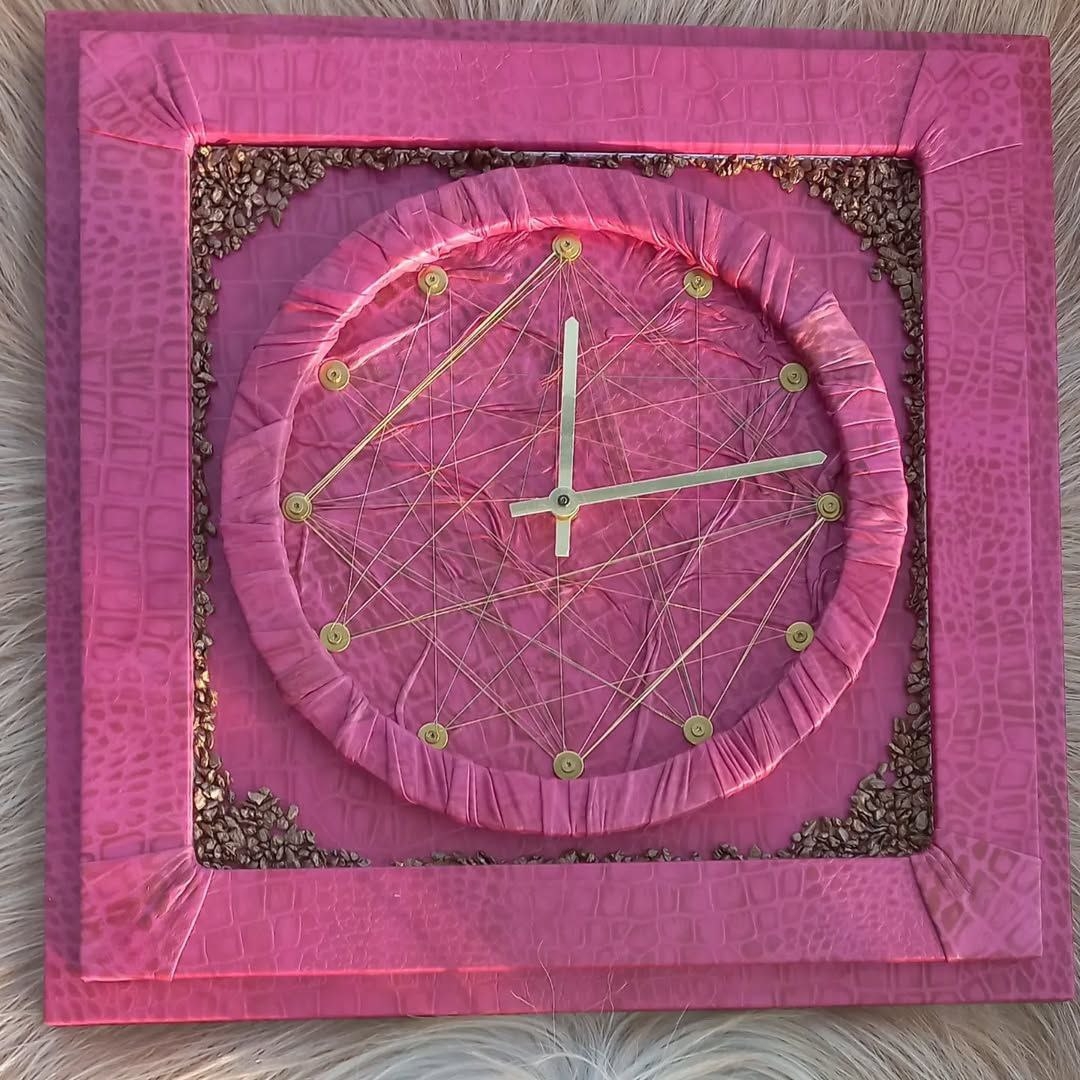 Авторские часы ручной работы c художественной обработки кожи, техника кожаной мозаики - татарские орнаменты, ручная техника плетения металлической нитью  «скань» размеры 50х50х3 см.