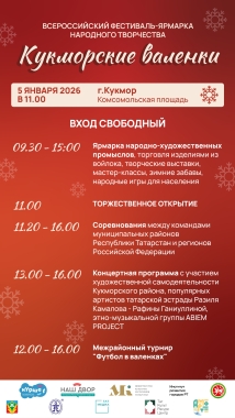 5 января 2026 года в городе Кукмор состоится XI Всероссийский фестиваль-ярмарка народного творчества «Кукморские валенки». Этот яркий зимний праздник, ставший одним из главных культурных брендов Кукморского района, пройдет при поддержке зимнего сезона фестиваля «Күрше», Администрации Кукморского района и АО «Кукморский валяльно-войлочный комбинат».