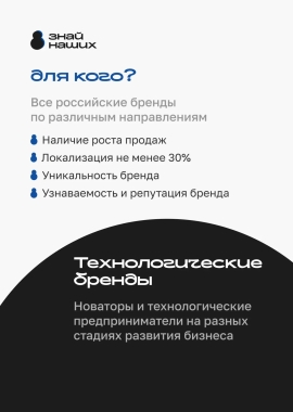 Конкурс #ЗнайНаших: за три сезона в конкурсе приняли участие 31 тыс. компаний, из них поддержку получили 3 тыс. российских брендов. Организаторы: АСИ, Росконгресс при поддержке ВЭБа.