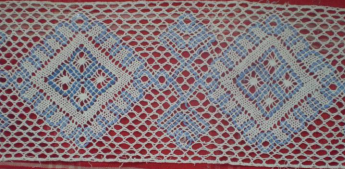 Непрерывная ломаная линия – зигзаг или «речка» в различных вариантах, как правило, применяется в виде прошв и края в полотенцах, или в виде обрамления композиций; задаёт ритмический строй изделиям. Они представляют собой зубчатый край мерного кружева в виде заострённых или округлых уступов, плотных или ажурных (среди них мотивы с вертикальным членением – «павлинка»). Собственно ромб, который трактуется весьма разнообразно – фигура плотная или с внутренней разработкой («кольцо» по Н.Т. Климовой). Внутреннее пространство его имеет сетчатое заполнение (4, 9, 16 или 36 ячеек), а внешний контур чаще гладкий, реже с лучиками – «гребенчатый ромб».