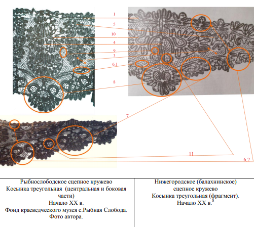 Выявлено, что для Рыбно-Слободского кружева характерен больший контраст и выразительность: в соотношении 1:5 верхней и нижней каймы; в заполнении решетки фона не только насновками, а розетками из насновок на фоне плетешковой решетки; в соотношении плотного узора и облегченного фона. Это свидетельствует о том, что Рыбно-Слободскому сцепному кружеву свойственен симметричный характер узоров и более реалистичная трактовка древа, влияние местного декоративно-художественного языка.