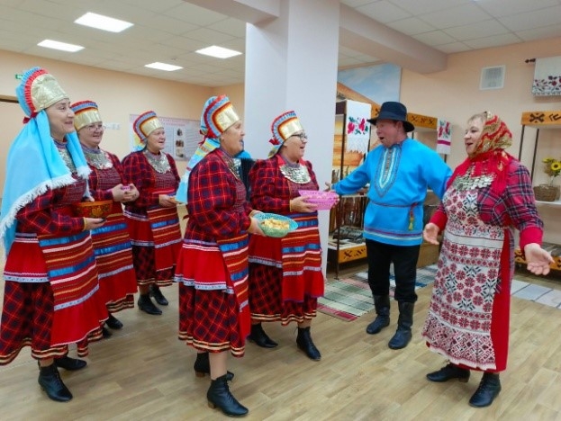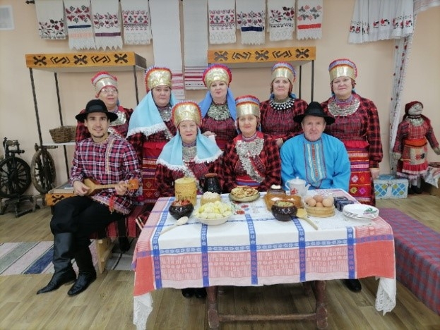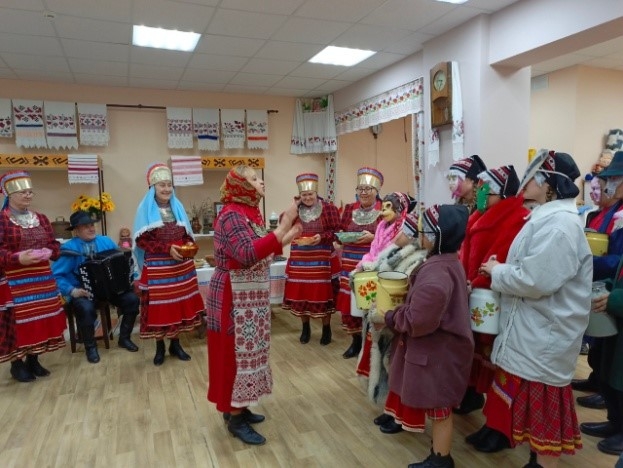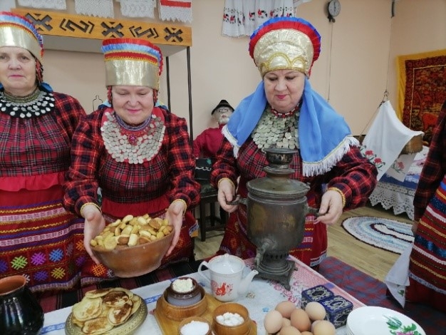 Гостей угощали главным блюдом - «шишара», мясом и молочными продуктами, так как скоро наступал пост. За столом под гармошку пели песни. Начинали запевать хозяева дома, гости подхватывали. Пели такие песни, как «Озын көй», «Поднос көе», танцевали «Комарский танец», или по-другому местные называли его «Ыштыр-ыштыр» (что означает звук, издаваемый во время танца ногами). Далее все переходили праздновать в другой дом, и так из дома в дом, навещая всех. Таким образом, они могли навестить больных, пожилых, которые не выходили на улицу. Но в каждом доме оставался один человек, обычно сноха, которая встречала ряженых.